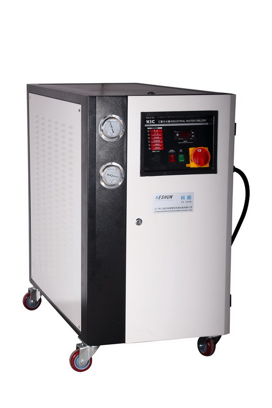 FEATURES: The KSC-W series of water-cooled water chillers use a single closed-loop design for pressurised refrigerant.All models are equipped with compressor and motor overload protection,phase shortage and reversal alarms, anti-freeze thermostat,pressure gauges,etc.They feature excellent performance and a long lifespan. The series of working flow is based on the basic principle of heat exchange. It is applicable to the industry that requires flow of precisely controlled chilled water,and considered as indispensable equlpment for modern industry.